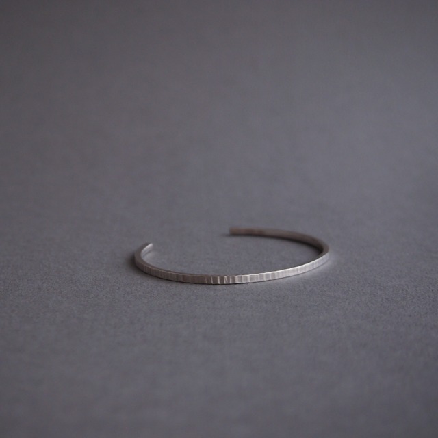 材質:925銀 サイズ:S,M(画像4枚目-左/S、右/M) サイズ詳細:幅2,厚み2mm S/バングル長さ125mm+開口部28mm M/バングル長さ145mm+開口部33mm 2mm角のシルバーに縦に槌目をつけたバングルです。 手作業で一方向に入れた槌目が柔らかさとすっきりとした印象とを作り上げています。 ユニセックスなデザインですので、ペアでもお楽しみいただけます。 手の力で形を変えられますのでご購入後にご自身で手首に合わせていただけます。 マット仕上げですが、使用していくうちに摩耗し艶が出てまいります。 少しずつ変化していく様をお楽しみください。 最後の画像は着用イメージです。大きさの目安としてご覧ください。 1点ずつ制作しておりますので、若干の誤差が生じる場合がございます。 予めご了承ください。 サイト下部にございます「特定商取引法に基づく表記」をご確認の上、ご注文をお願いいたします。