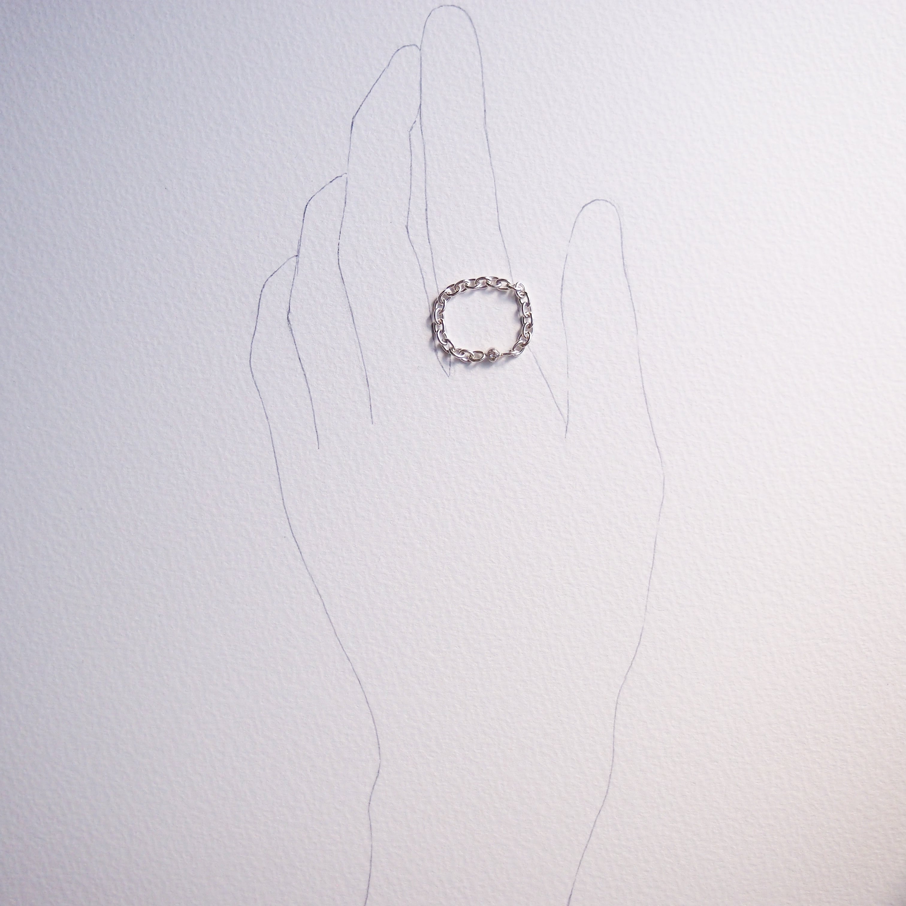 小石のような小さな銀の粒に小さなダイヤモンドをセッティングして、チェーンリングを制作しました。